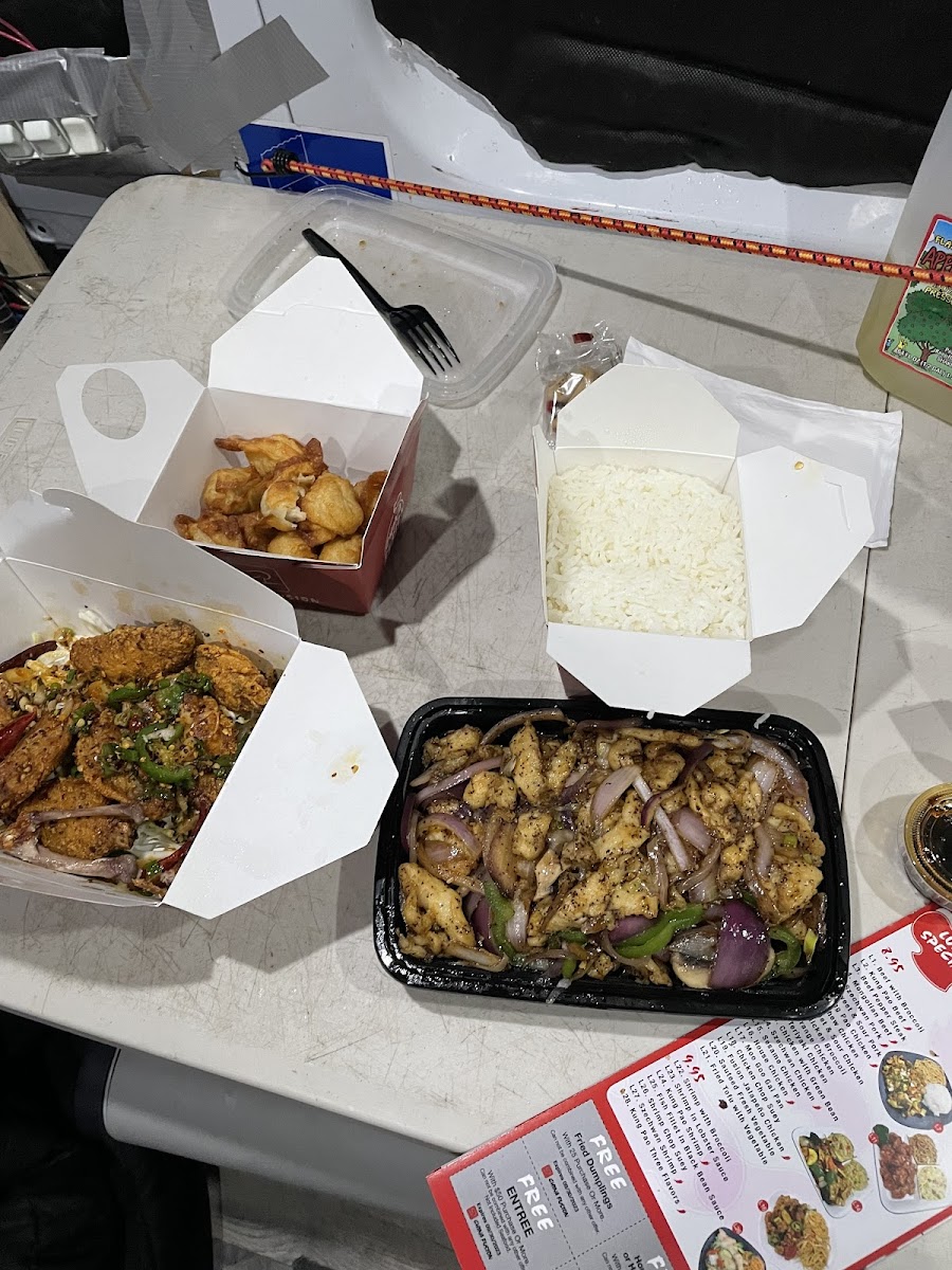 Kung Pao chicken, beef, and shrimp. Choice of rice, chow mein, or vegetables.